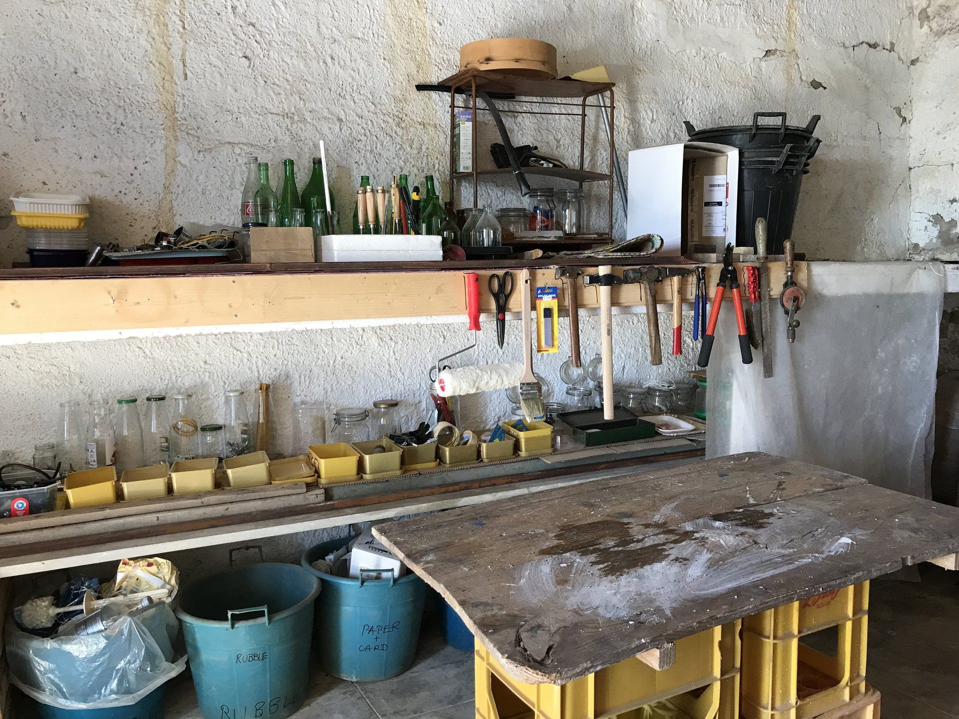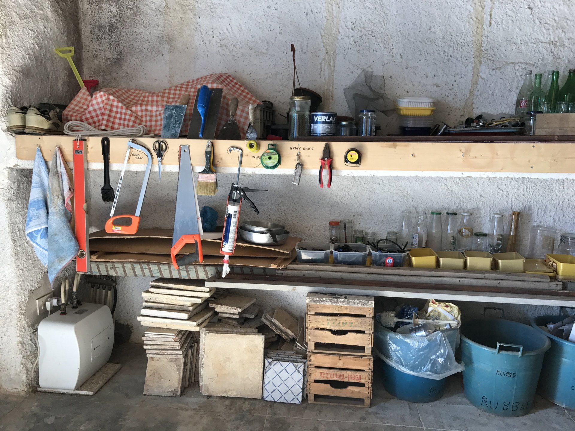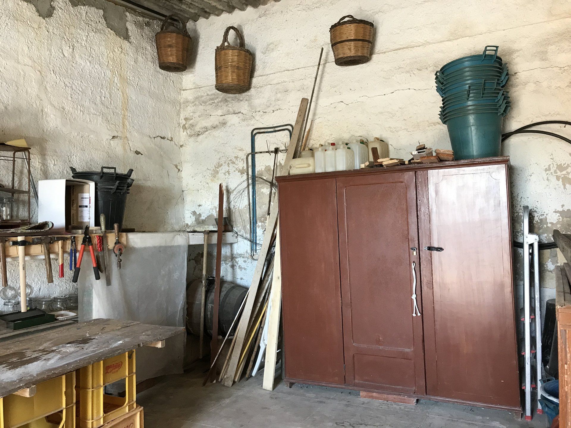 Garage 4 is looks out towards the vineyard and future garden. When cleared, there is sufficient room to park a car, It also contains some basic workshop tools for domestic DIY repairs.