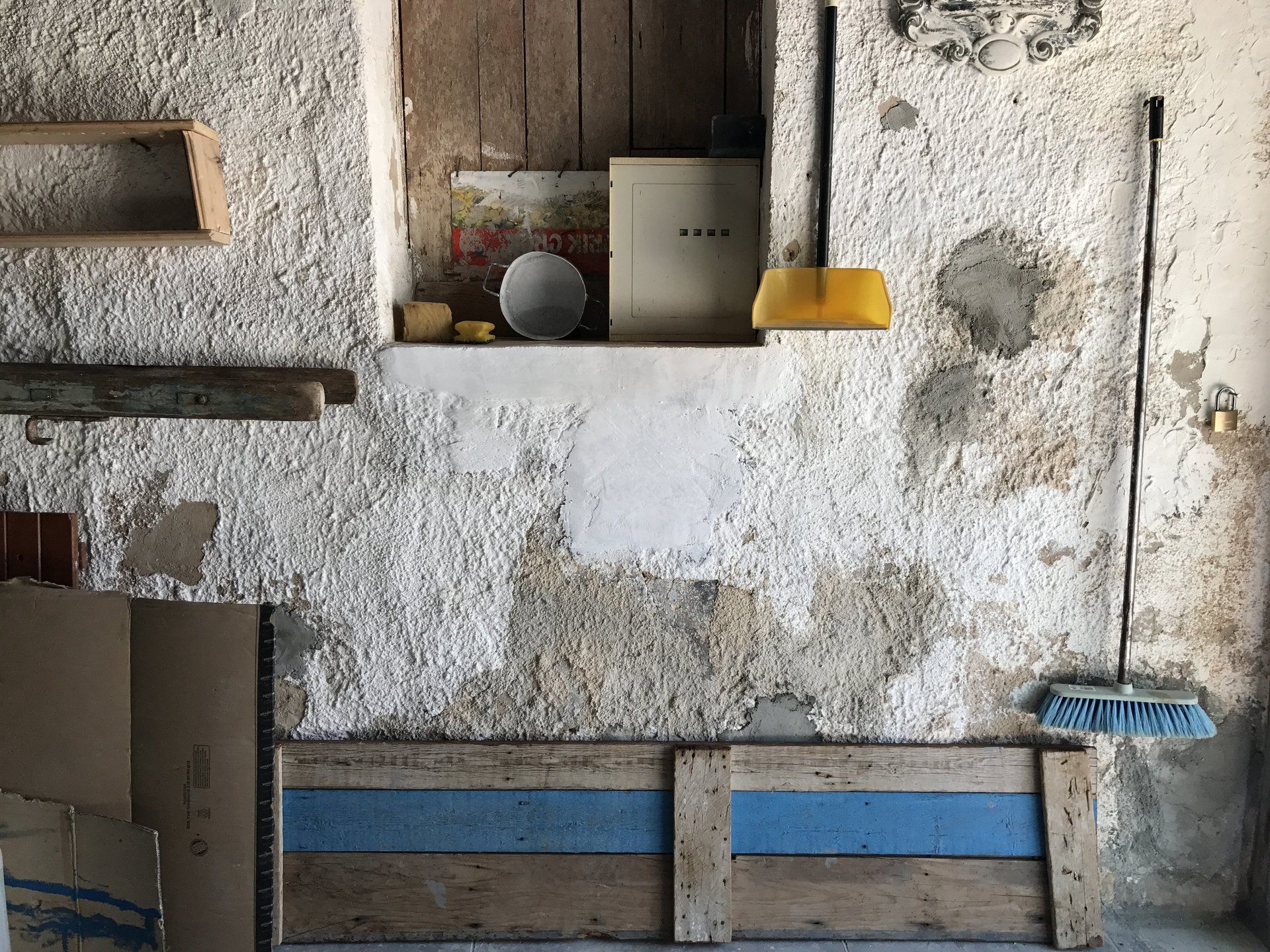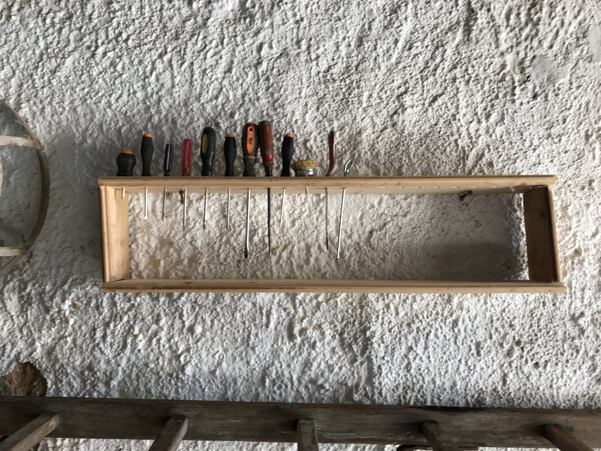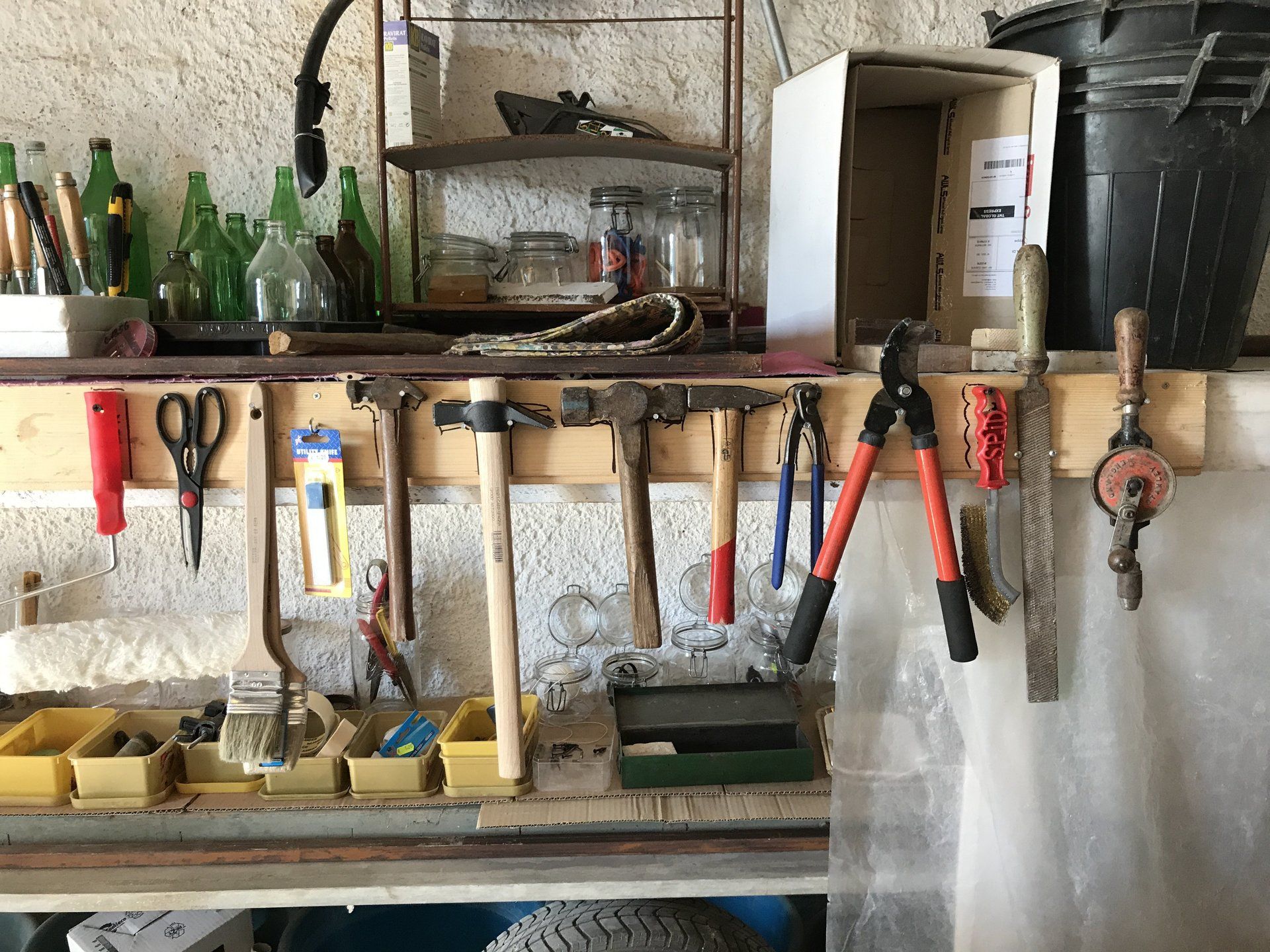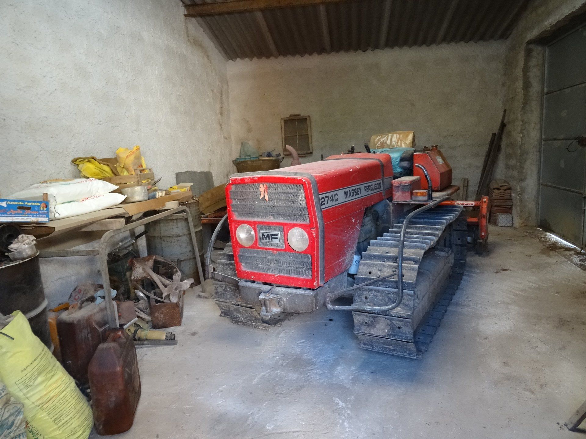 Garage 4 is looks out towards the vineyard and future garden. When cleared, there is sufficient room to park a car, It also contains some basic workshop tools for domestic DIY repairs.